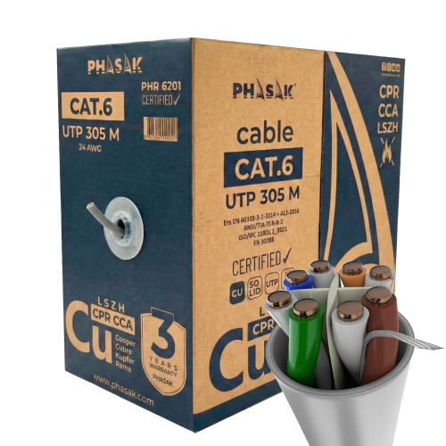 La bobina de cable de red Phasak PHR 6201 UTP Cat.6 está diseñada para instalaciones profesionales que requieren alto rendimiento en transmisión de datos y cumplimiento normativo en seguridad contra incendios. Fabricado en cobre 100% y con cubierta LSZH (Low Smoke Zero Halogen), este cable garantiza conexiones estables Gigabit y una instalación segura en edificios donde se exige certificación CPR Cca.