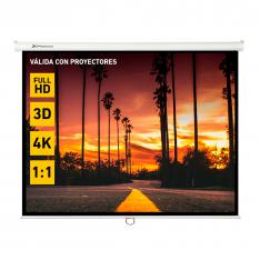 Pantalla de proyección manual plegable de 2 x 2 metros y 112″ blanco mate con cajetín de acero ideal para cine en casa, aulas de colegios, salas de conferencias, etc. Esta pantalla de proyección se despliega fácilmente con solo tirar de la anilla pudiéndolas parar donde quieras y adaptarlas así al formato que te interese 1:1, 4:3 y 16:9.