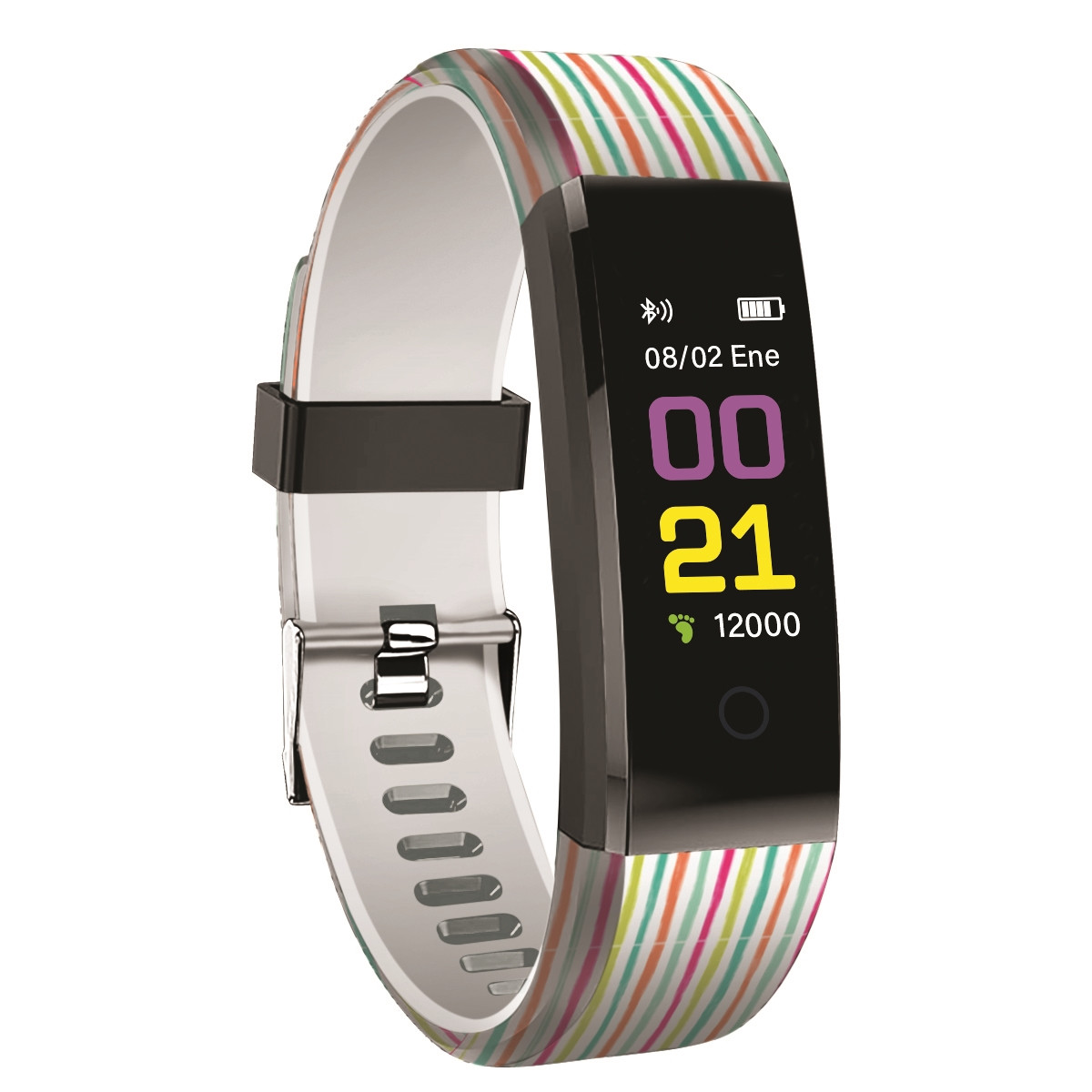 Pulsera de actividad y salud Health Pop de muvit iO con estampado de rayas multicolor.