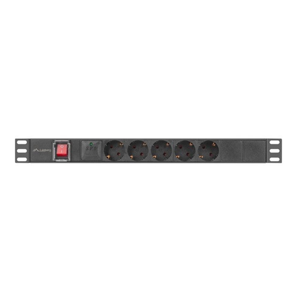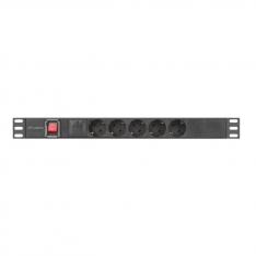 Regleta de 5 enchufes con conector Uni-schuko y enchufe europeo Type F, ideal para armarios rack de 19″. Fabricada en aluminio resistente, presenta un diseño horizontal en color negro con interruptor integrado, perfecta para instalaciones profesionales que requieren una distribución eléctrica fiable.